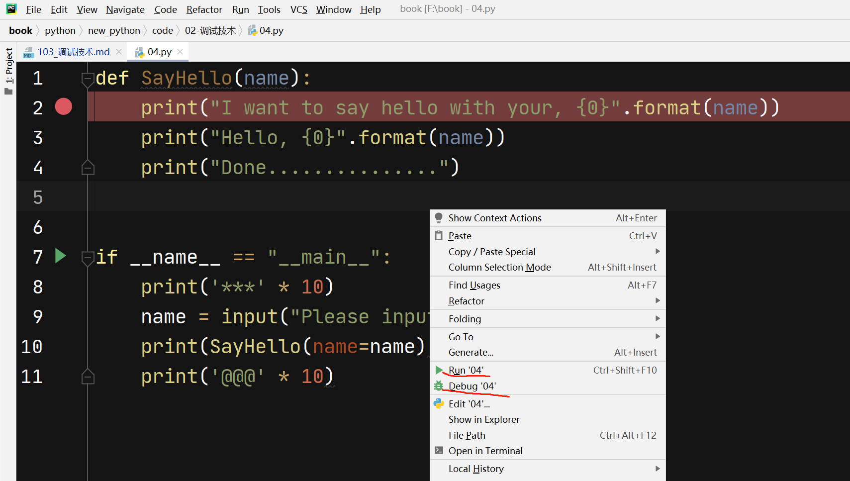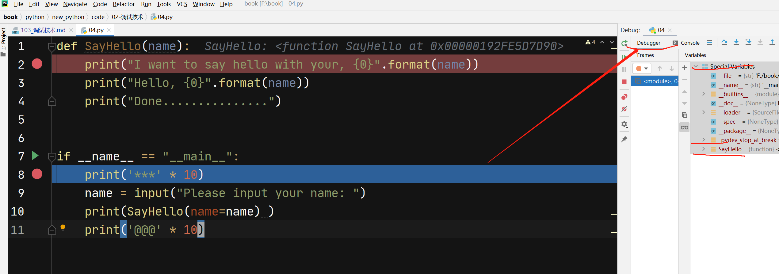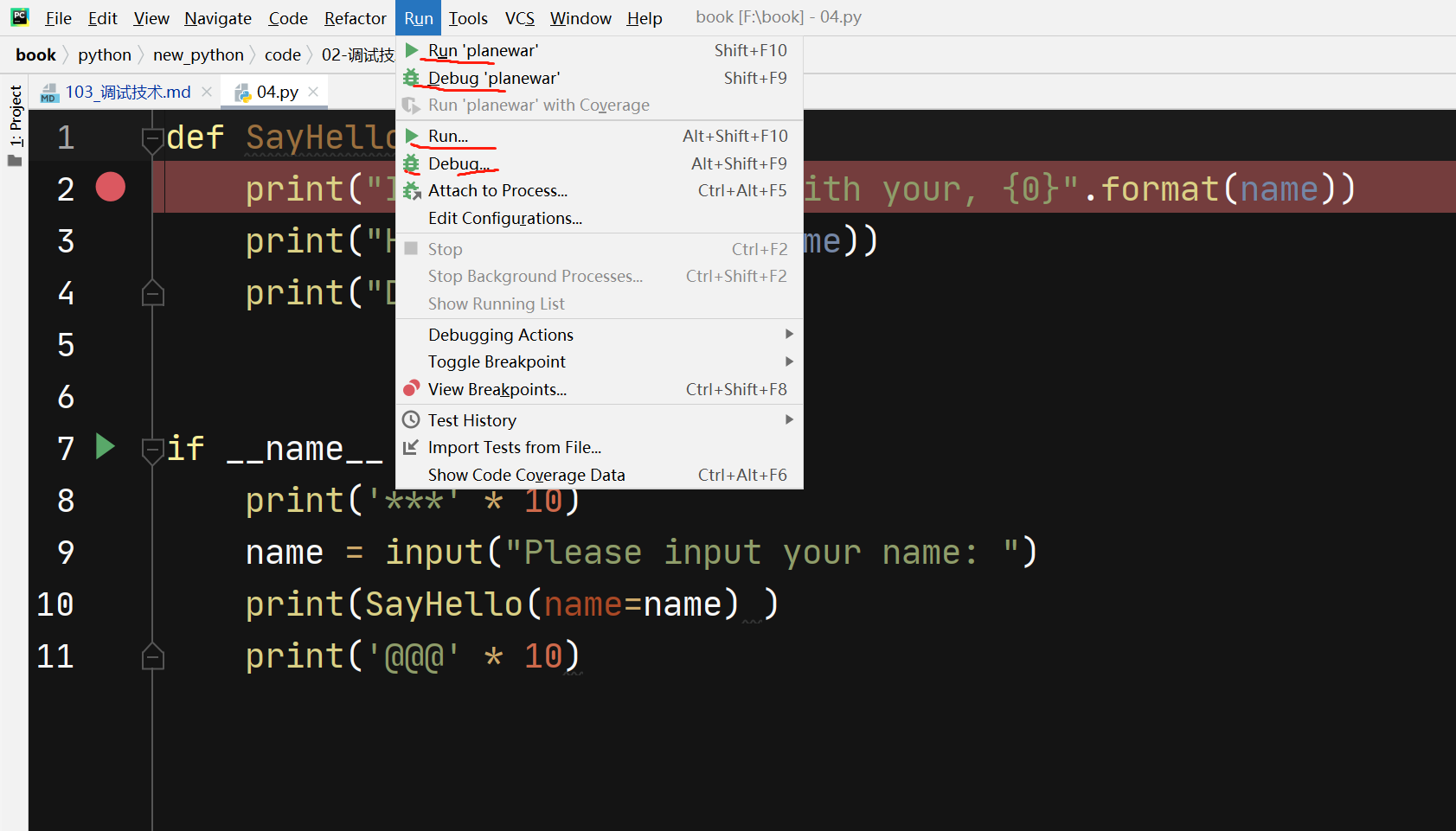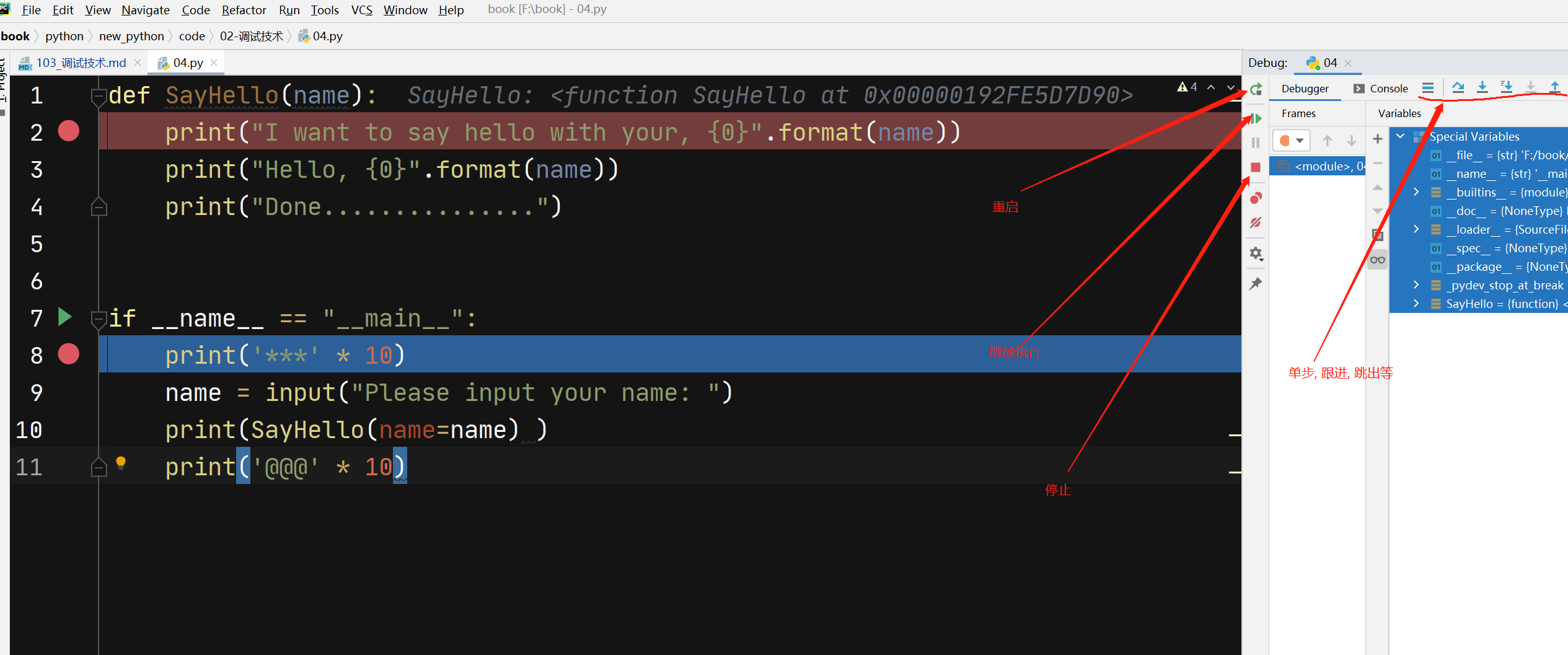 Breakpoint 1 at f:\book\python\new_python\code\02-调试技术\03.py:5