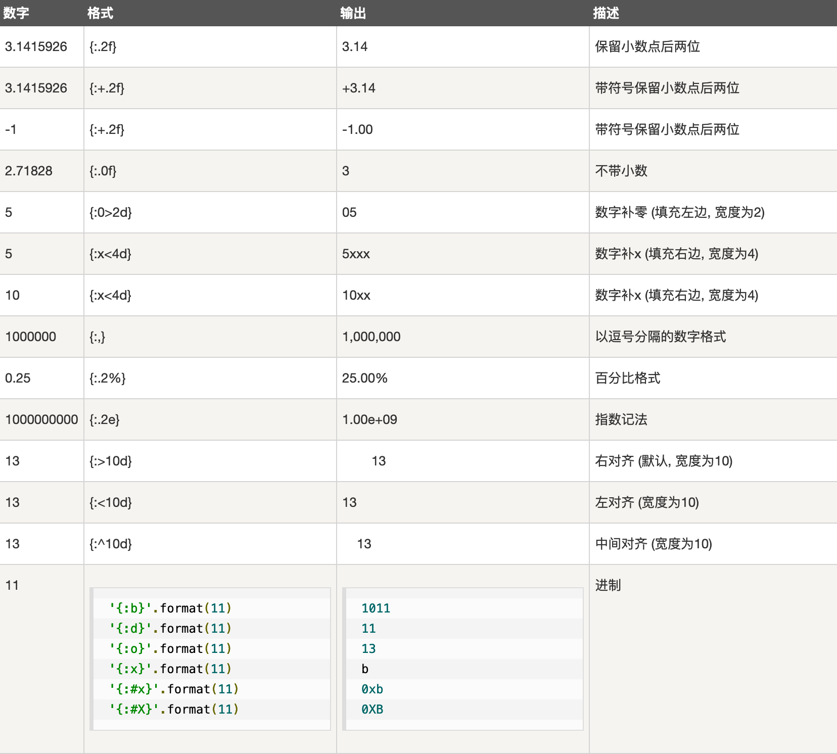^, <, >分别是居中、左对齐、右对齐,后面带宽度,:号后面带填充的字符,只能是一个字符,不指定则默认是用空格填充。+表示在正数前显示+,负数前显示-; (空格)表示在正数前加空格b、d、o、x分别是二进制、十进制、八进制、十六进制。